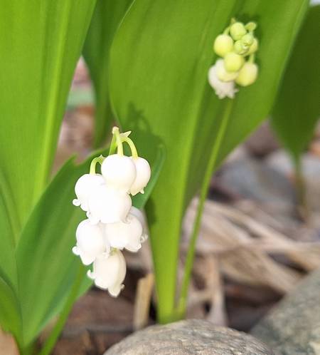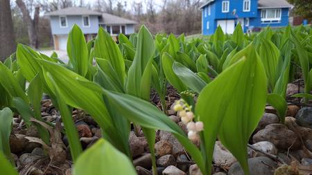 RN I was so pleased to find out the green things poking out of the rocks in front of my house are Lilies of the Valley! They are just starting to bloom, but now it's going to rain for a week and probably ruin them. You wouldn't believe the beautiful scent as you past them. Thank goodness they are in the front yard and not the back since they are poisonous to dogs.