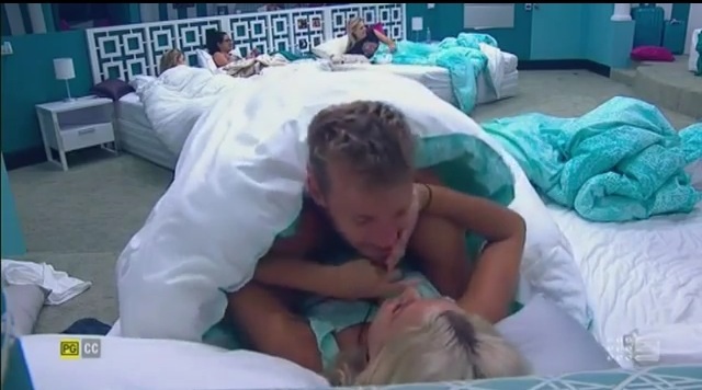 Big brother informs the other housemates that two of their housemates have gotten into bed outside of the snooze zone.