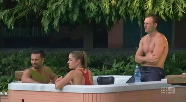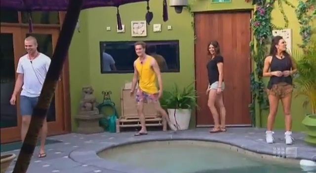 The intruder housemates in the sanctuary jump in the pool, and make enough noise to be heard by the other housemates.