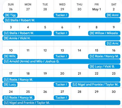 RN Holy smokes, it's not even April yet and look and my May dog schedule. Not a single day off. I'm not complaining! I need to save a bunch to finish getting this house into shape.